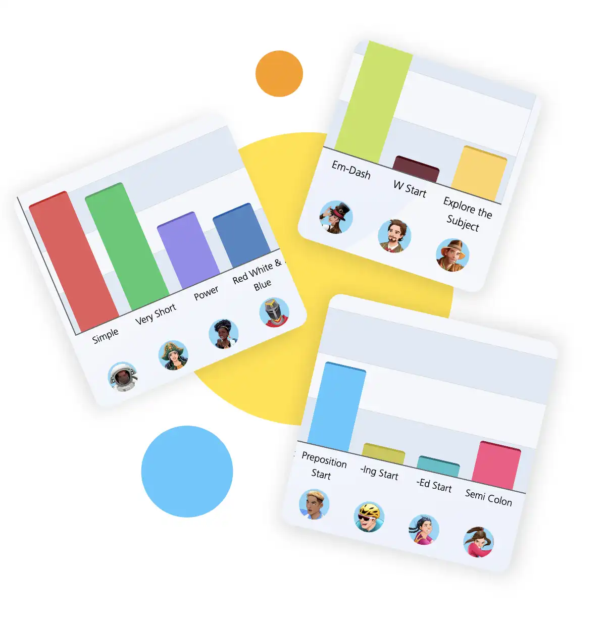 Class performance dashboard gives teachers easy access to critical writing metrics for their students. Click each tile to reveal a deeper look into each metric: see patterns and ascertain class writing progress data. Instantly know what they’re doing well. Where intervention is needed and how to achieve it. If your students are only hitting an average sentence length of 12 words at the start Term 2? Set a goal of 16 words by the end of Term 2 and track it daily. Achieving targets has never been easier.